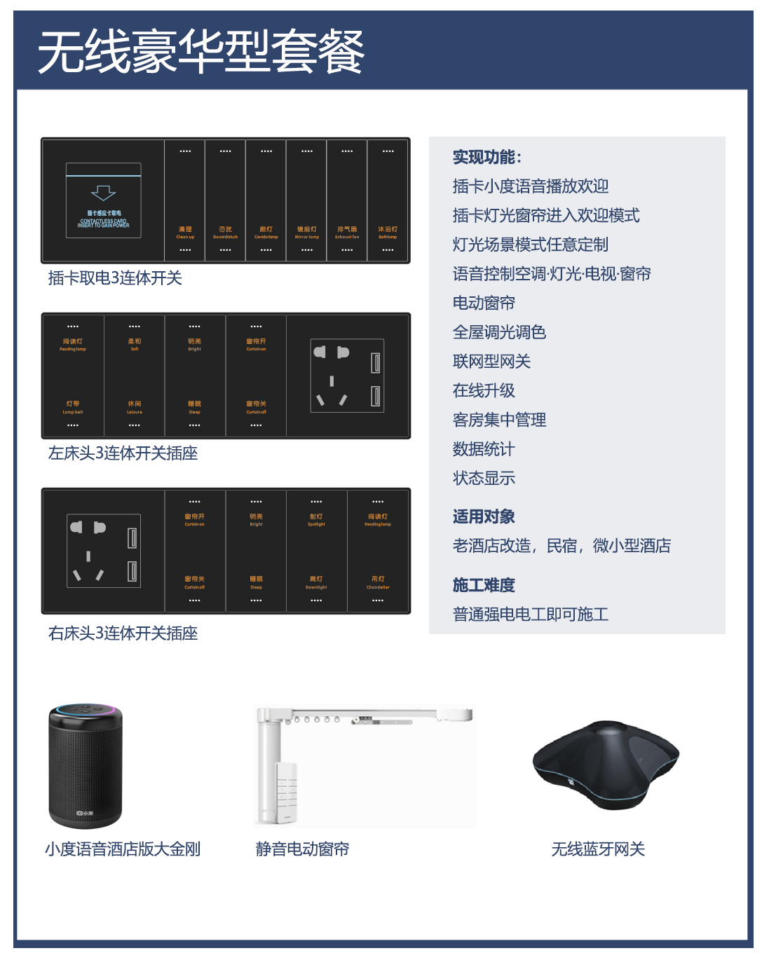 智慧酒店解决方案优势在于零����� �������Ƴ����������� �������Ƴ����������� �������Ƴ������������ �������Ƴ�������布线,不停业,少换新,适用于老酒店改����� �������Ƴ����������� �������Ƴ������������ �������Ƴ������������ �������Ƴ�������造,民宿,微小型酒店。以下两种套餐����� �������Ƴ����������� �������Ƴ����������� �������Ƴ������������ �������Ƴ�������适用于各种类型酒店智能配套仅供参考。